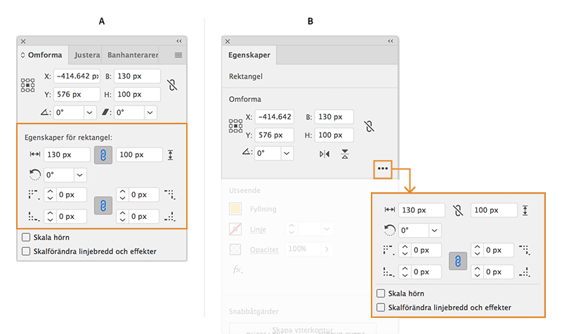 - I avsnittet Omforma på panelen Egenskaper (Fönster > Egenskaper) klickar du på knappen Fler alternativ (