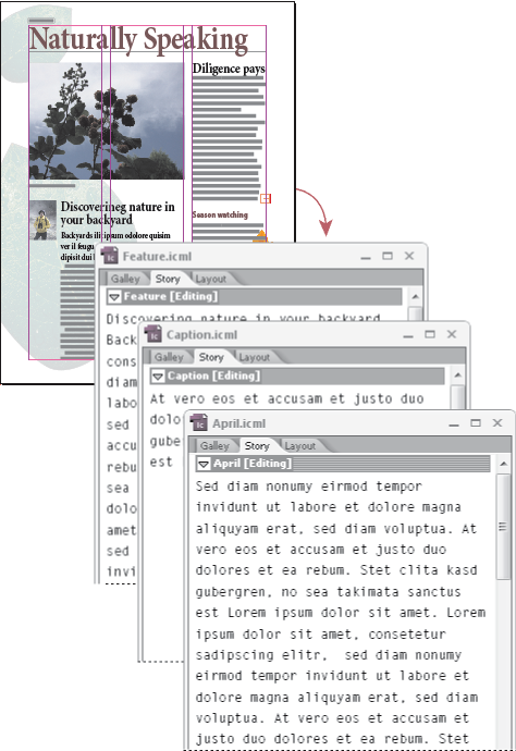 Oavsett om innehållsfilerna redigeras i InCopy kan InDesign-användare arbeta med dokumentlayouten. De behöver inte checka ut dokumentet för att kunna göra det. Varje gång InCopy-användaren sparar det utcheckade innehållet, kan InDesign-användaren uppdatera samma innehåll i layouten för att kunna se de senaste ändringarna.