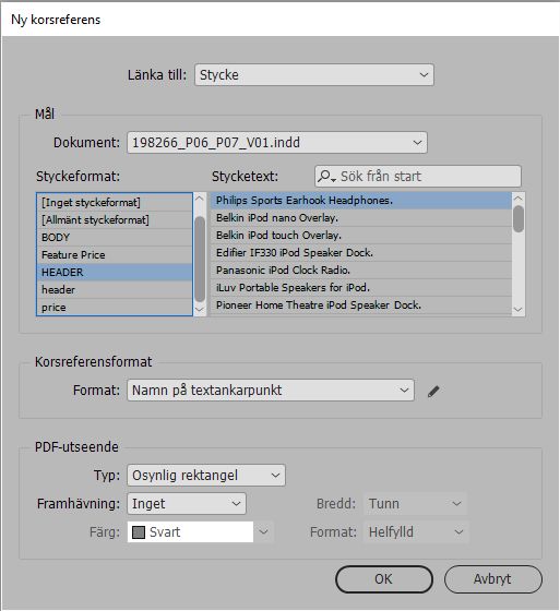Korsreferenser tas med i exporterade Adobe PDF-filer om alternativet Hyperlänkar är markerat i dialogrutan Exportera till Adobe PDF i InDesign. Korsreferenser tas med i exporterade SWF-filer om Inkludera hyperlänkar är markerat i dialogrutan Exportera SWF.