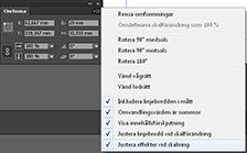 Använd omformningspanelen om du vill visa eller ange geometrisk information för ett markerat objekt, inklusive värden för placering, storlek, rotation och skevning. Med de kommandon som finns på omformningspanelens meny har du tillgång till fler alternativ och snabba sätt att rotera eller spegelvända objekt på.