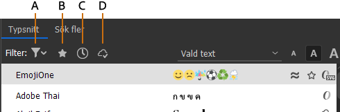 Du kan visa exempel på ett teckensnitt i en teckensnittsfamilj samt teckenstilen på menyerna på panelen Tecken och i andra områden i programmet där du kan välja teckensnitt. Följande ikoner används för att visa olika sorters teckensnitt: