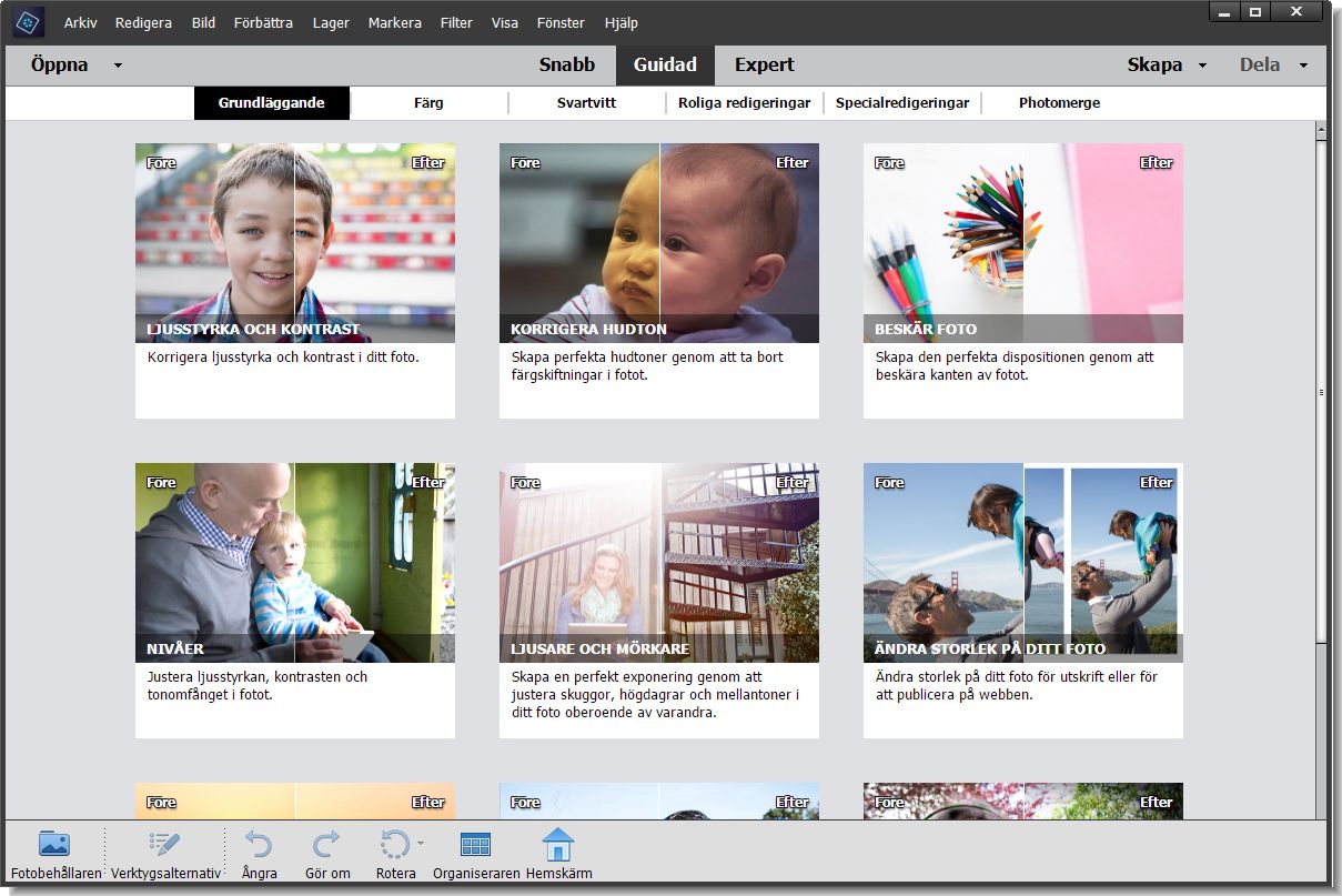 På skärmen för läget Guidad grupperas guidade redigeringar i sex kategorier. Öppna fotot du vill förbättra och klicka på miniatyrbilden för att få upp en kategori för att utforska mer.