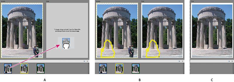 Med funktionen Photomerge Compose kan du ersätta delar av en bild. Du kan till exempel markera en person i ett foto och lägga till markeringen i ett annat foto. Du behöver två bilder - en källa och ett mål. Du kan markera ett område, beskära det i källfotot, klistra in det i målfotot och sedan justera proportionalitet och färg för det för att uppnå ett så naturligt resultat som möjligt.