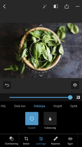 I Photoshop Express hittar du Oskärpa i panelen Justeringar. Du kan välja mellan två alternativ för oskärpa: