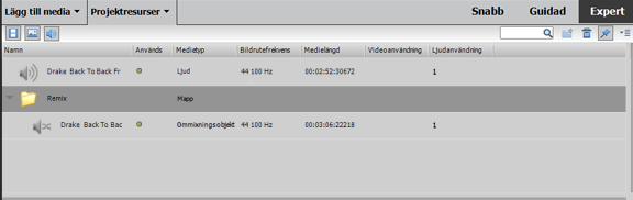 När ett klipp mixas om, skapas mappen Ommixning på panelen Projektresurser för det nya, ommixade ljudklippet. Det ommixade ljudklippet kan sedan användas var som helst på tidslinjen som ett vanligt ljudklipp.