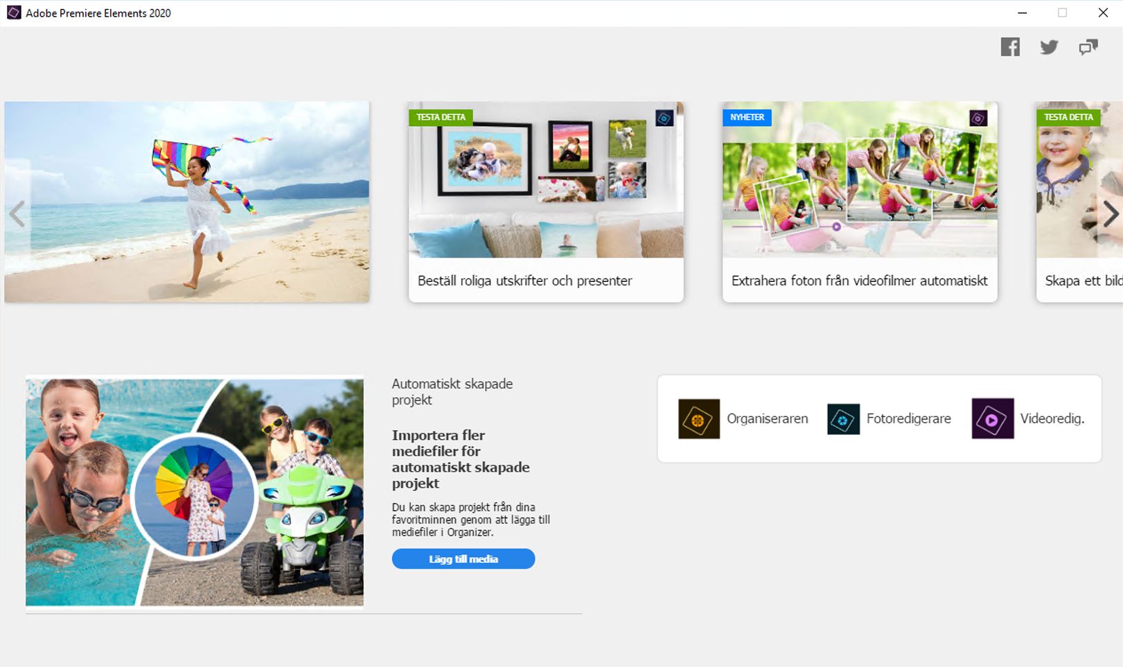 På den nya startskärmen i Elements skapas automatiskt genererade bildspel, videobildspel och collage bara för dig och som visas när programmet startas. Se också vad som är nytt sedan din senaste version, upptäck roliga saker att prova och få inspirerande idéer, hjälp och självstudiekurser.