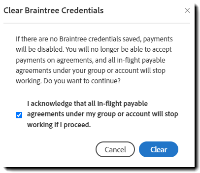 Inaktivera integreringen mellan Acrobat Sign och Braintree, och ta bort autentiseringsuppgifterna från kontoinställningarna genom att:
