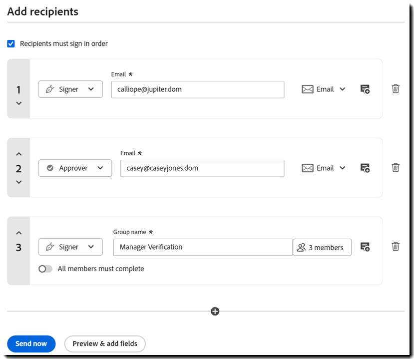Om du vill definiera ett sekventiellt signaturflöde aktiverar du alternativet Mottagare måste signera i ordning i avsnittet Lägg till mottagare när du konfigurerar avtalet.