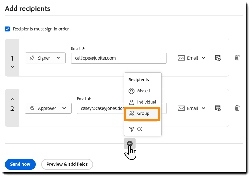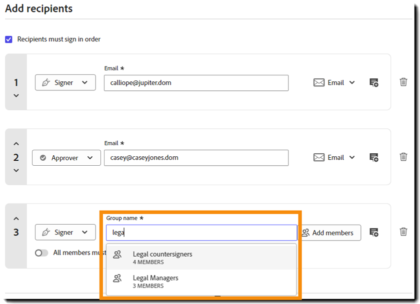 Alla medlemmar i mottagargruppen får den slutliga PDF-kopian av det signerade avtalet även om de inte specifikt har deltagit.
