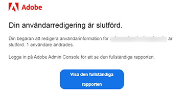 När alla användare har uppdaterats korrekt med sina nya tilldelningar får du nedanstående e-postavisering från Adobe.