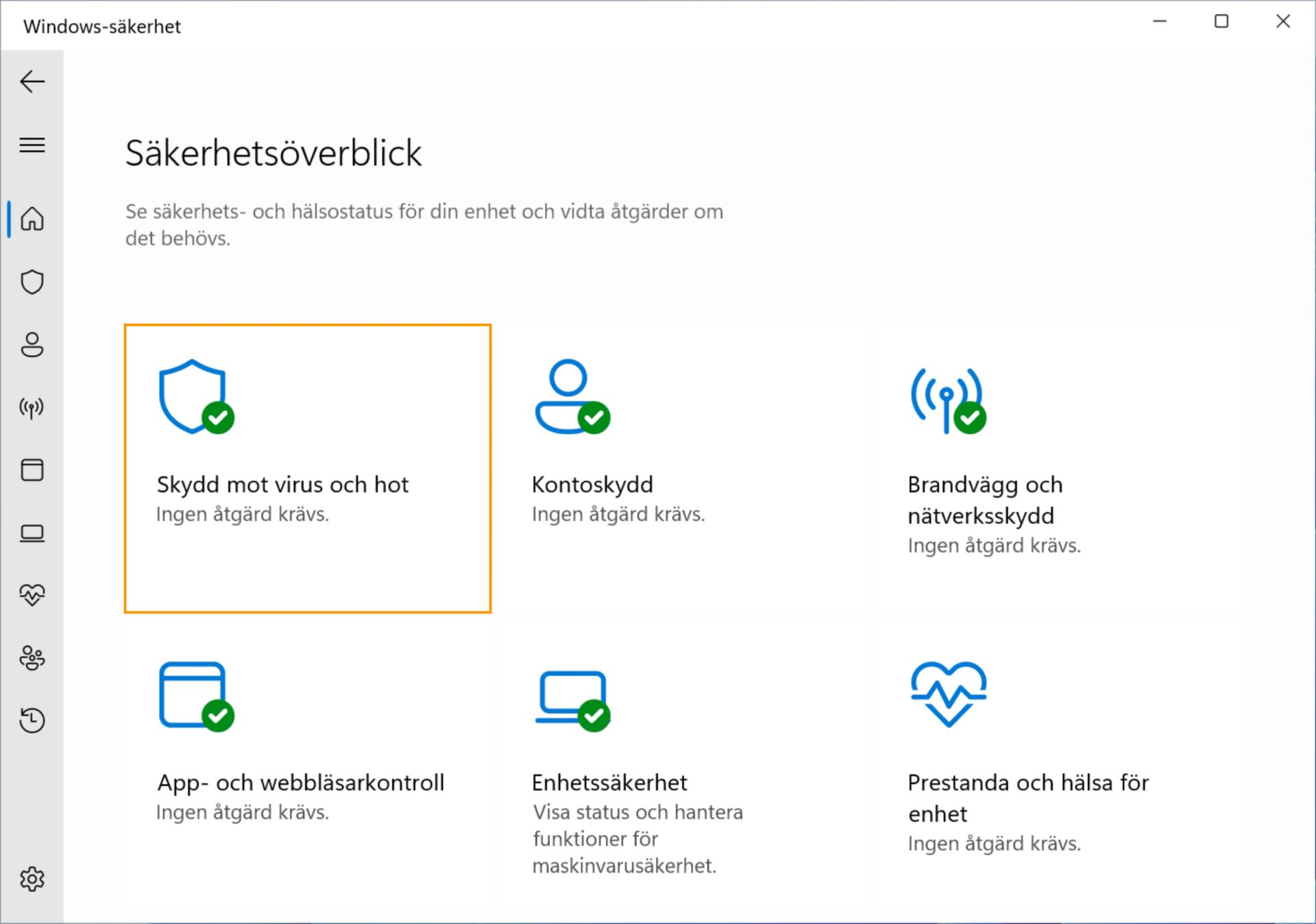 Du kan också välja Start > Inställningar > Uppdatera och säkerhet > Skydd mot hot och virus.