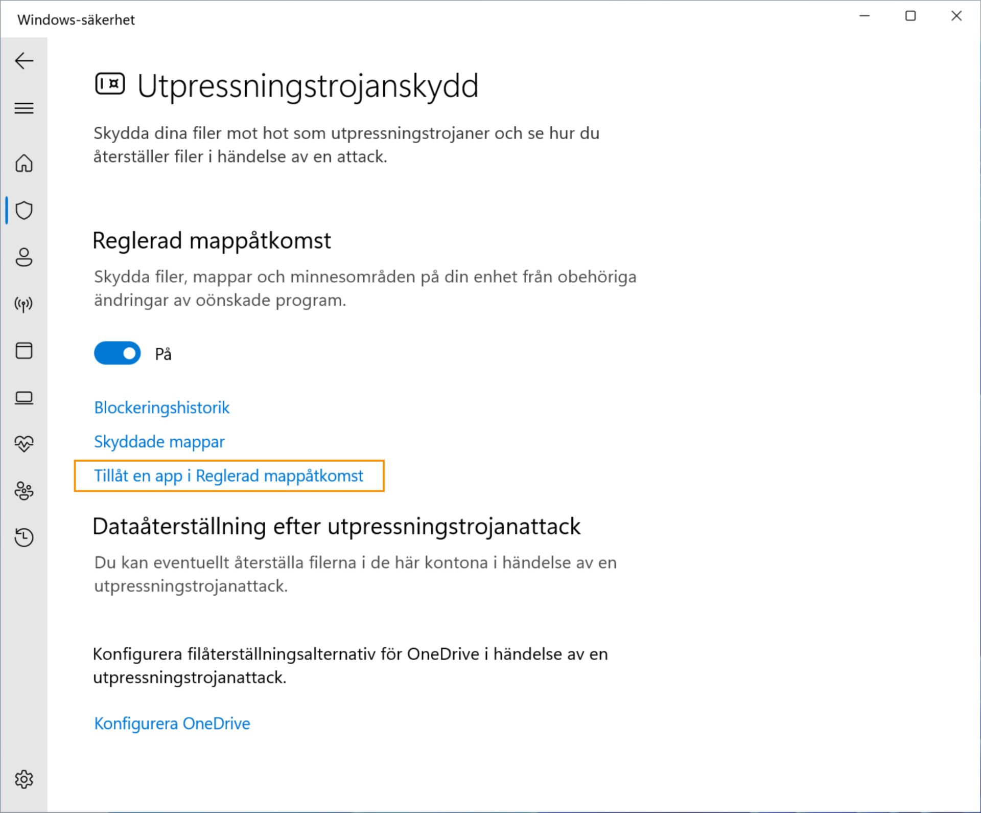 Markera alternativet Tillåt en app i Reglerad mappåtkomst.