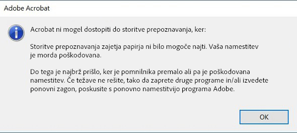 Ko poskušate uporabiti optično prepoznavanje znakov (OCR) na skenirani strani ali sliki, Acrobat morda ne bo mogel dostopati do storitve OCR zaradi pomanjkanja sistemskega pomnilnika, nepopolnih/poškodovanih datotek, nepodprtih formatov, zastarele programske opreme ali neustreznih virov. Acrobat prikaže naslednjo napako: "Acrobat ni mogel dostopati do storitve prepoznavanja, ker ni bilo mogoče najti storitve prepoznavanja za zajem papirja"