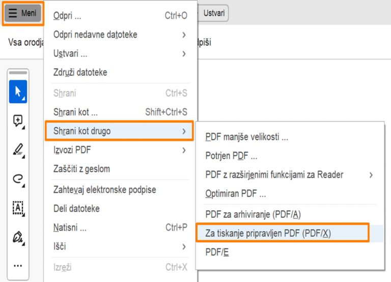 S programom Acrobat odprite PDF in izberite meni s tremi črtami (Windows) ali meni Datoteka (macOS) > Shrani kot drugo > Za objavo pripravljen PDF (PDF/ X).