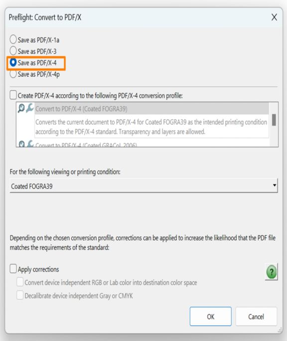 Opomba:Izberete lahko profile pretvorbe PDF/X-4, ki so na voljo in so našteti v razdelkuUstvari PDF/X-4 v skladu z naslednjim profilom pretvorbe PDF/X-4 in Dodaj popravke po potrebi.