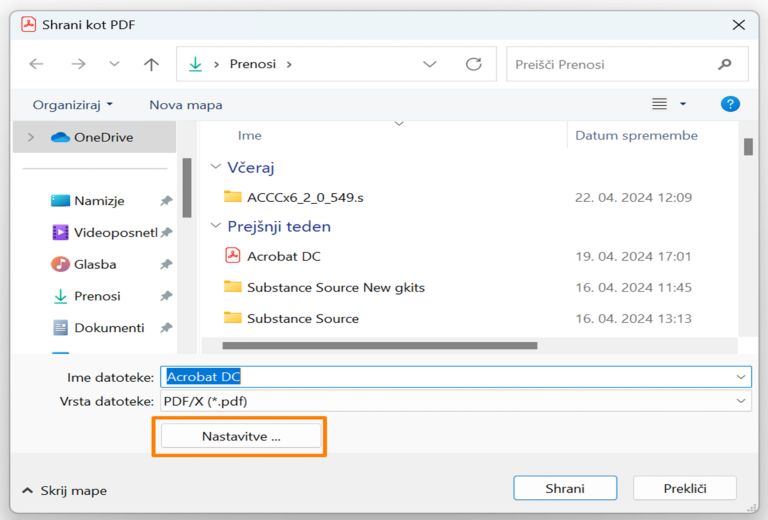 V pogovornem oknu Shrani kot izberite Nastavitve.