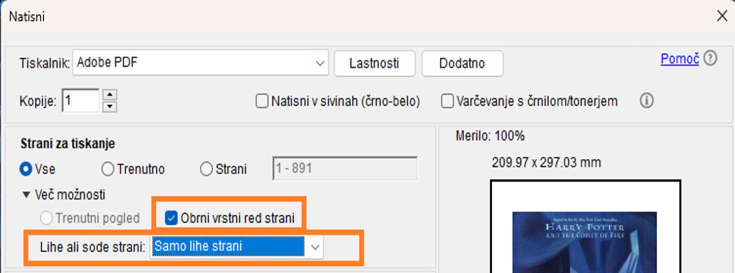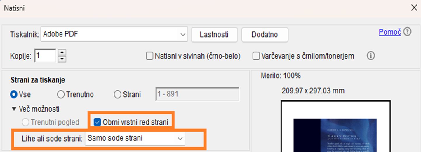 V pogovornem oknu Tiskanje izberite razdelek Strani za tiskanje in izberite možnost Obrni strani in nato Samo lihe strani. V prikazanem primeru možnost Obrni strani zagotavlja, da je zaporedje strani pravilno.