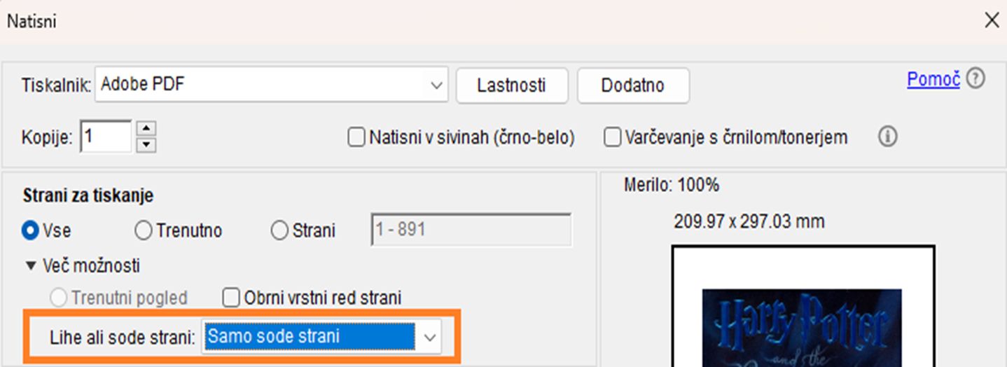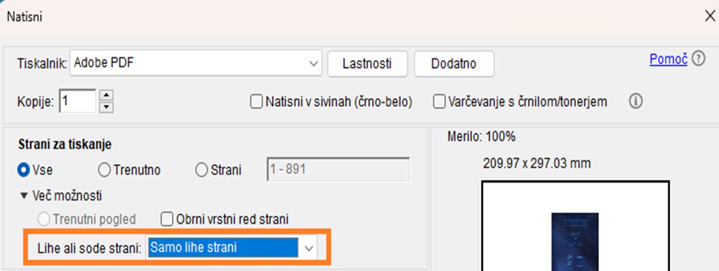 Izberite Meni s tremi črtami (Windows) ali meni Datoteka (macOS) > Natisni, nato izberite možnost Samo lihe strani v razdelku Strani za tiskanje v pogovornem oknu Tiskanje. (Tokrat ne izberite možnosti Obrni strani.)