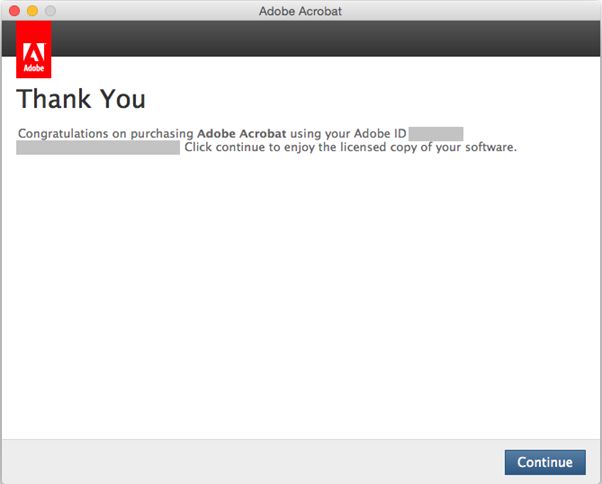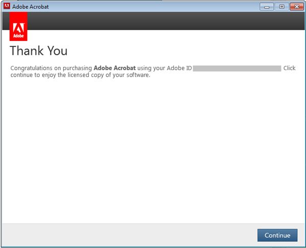 Prikaže se pogovorno okno z zahvalo.Kliknite Nadaljuj in nato ponovno zaženite Acrobat, da ga aktivirate.