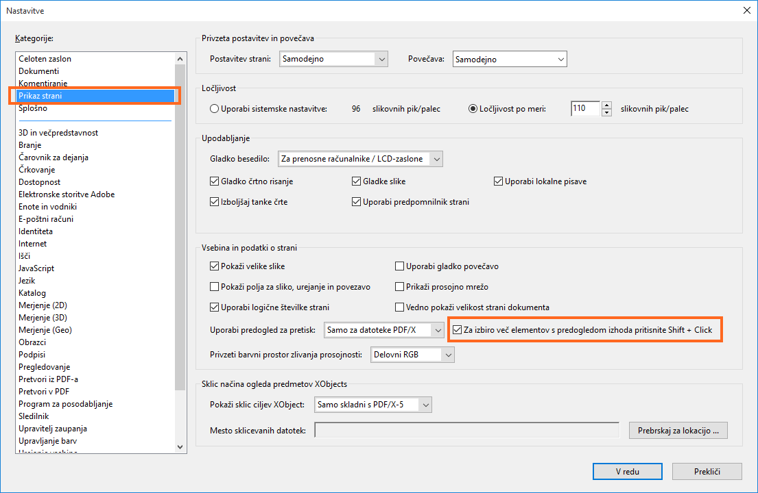 Če želite to funkcijo onemogočiti, pojdite na Urejanje > Nastavitve > Prikaz strani in prekličite izbiro potrditvenega polja Uporabi Shift in klik za večkratno izbiro s predogledom natisa v razdelku Vsebina in podatki o strani.