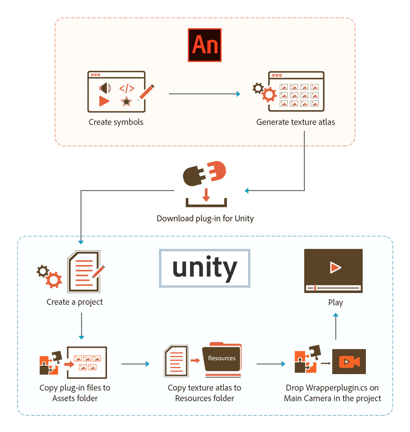 The process of generating a texture atlas in Animate and importing it in Unity is depicted in the following diagram: