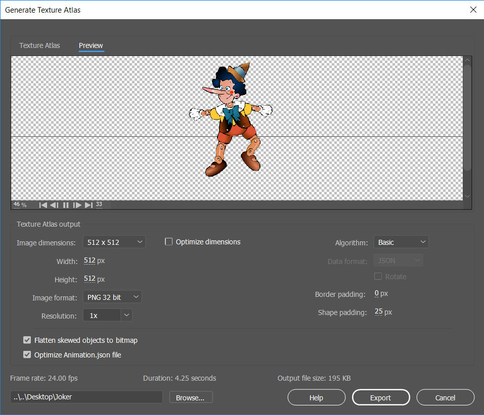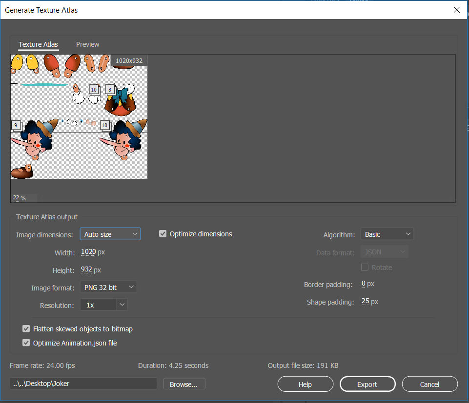 3. Choose the appropriate export options for texture atlas.
