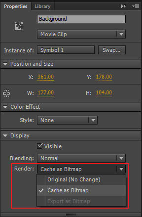 For example, when you create an animation with a complex background, create a movie clip containing all the items included in the background. Then select Cache as Bitmap for the background movie clip in the Property inspector. During playback, the background is rendered as a bitmap stored at the current screen depth. Browser draws the bitmap on the Stage quickly and only once, letting the animation play faster and more smoothly.