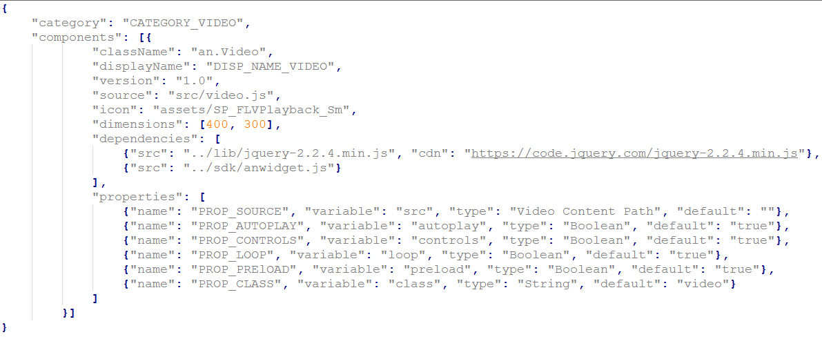 The set of dependencies for the component. This is an array where each entry provides the relative path for a local source (with key = “src”) and CDN path (with key=’cdn’). The CDN path is not mandatory. This path is used when you use hosted libraries in the publish settings. Otherwise the local source will be used when you preview or publish. Do note the relative path used in the example above (video). Its loading the dependencies from one level above, which allows us to share some dependencies across multiple component sets. |