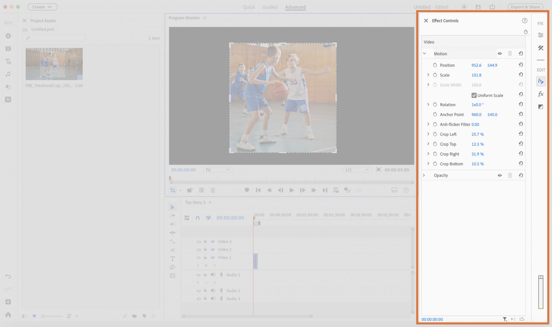 Sometimes you need precise control over how your clip is framed. Using the Effect Controls panel, you can adjust the crop settings manually to shape your visuals exactly the way you want.