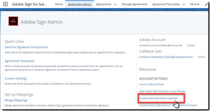 Salesforce is performing infrastructure upgrades which may result in the name of your Salesforce instance changing. If this occurs, you will need to refresh your auto update setup. To do this, go the Adobe Sign Admin page and select Enable Automatic Status Updates.