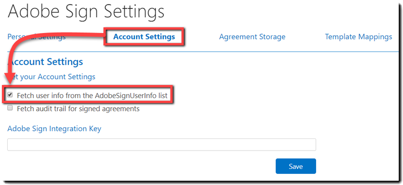 New installations require an Integration Key to be generated in Adobe Sign and then entered into SharePoint. This key is the access token that authenticates the Adobe Sign and SharePoint environments to trust each other and share content.