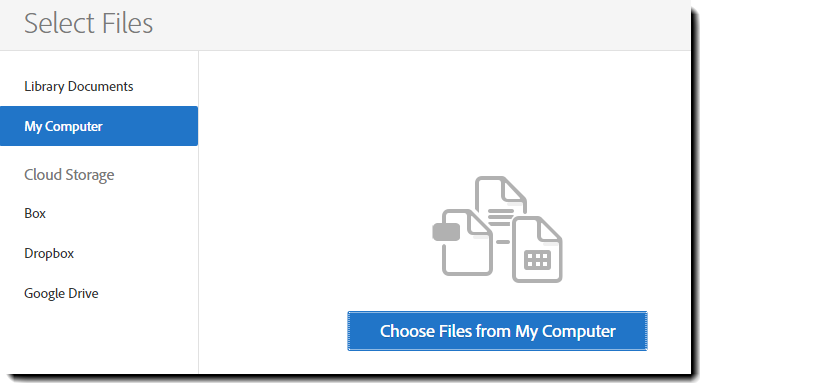 Files can be attached from either the Adobe Sign library, Google docs, Box.net, Dropbox, or uploaded from your local system using file search or drag and drop.