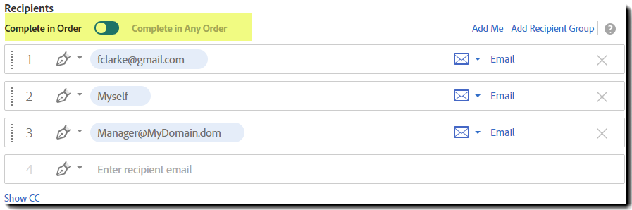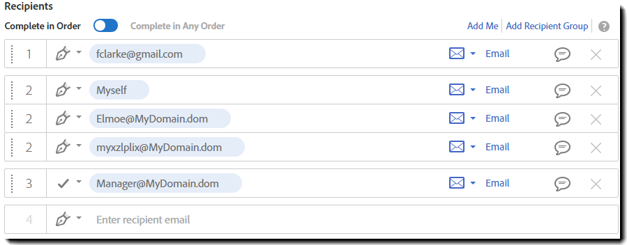 • When Complete in Order is enabled (as shown below), recipients are numbered to indicate the participation order and a sequential signing process is observed from one signing step to the next
