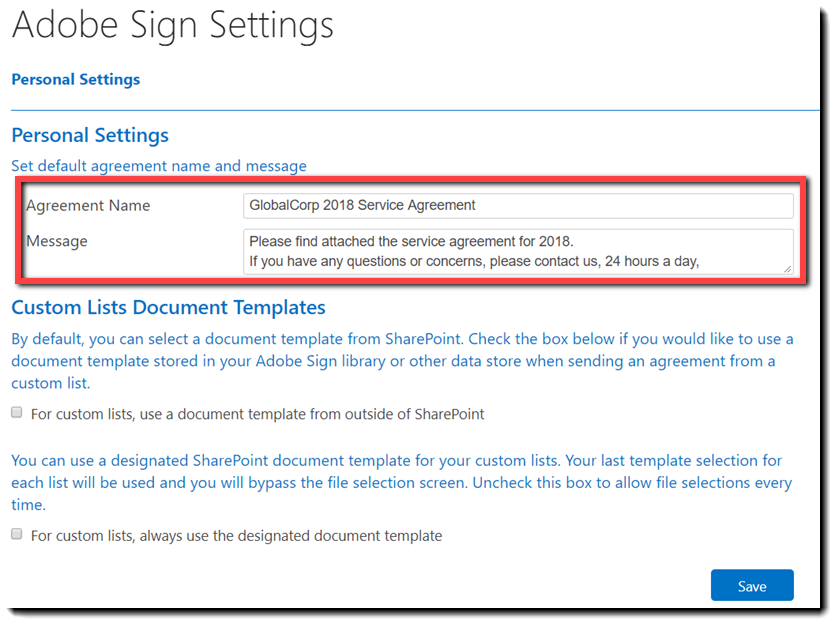 Your personal settings allow you to define a default agreement name and message for all of the agreements that you send from SharePoint using the Adobe Sign app.