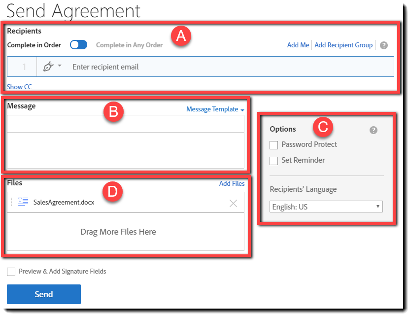 Just under the Files list you will see the Preview & Add Signature Fields check box. This option allows you to open the documents that you upload and place form fields as needed on the document.