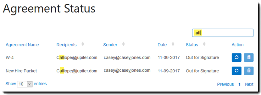 Status - The current status as the agreement as it relates to the signature cycle. (The below example is using the All option, so multiple statuses are displayed)