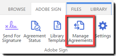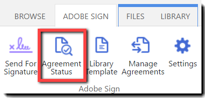 Once an Agreement is sent, tracking its progress is best done on the Agreement Status page, accessed through the Agreement Status icon on the Adobe Sign ribbon