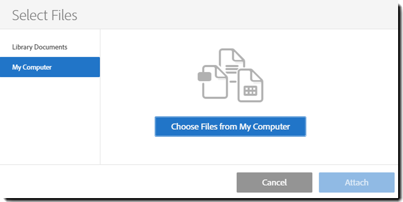 Files can be attached from either the Adobe Sign library, or uploaded from your local system using file search or drag and drop.