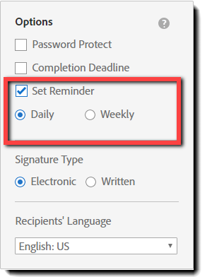 ► Set Reminder – Set the frequency (daily or weekly) of reminders to be sent until the agreement is completed. Only the current recipients are notified