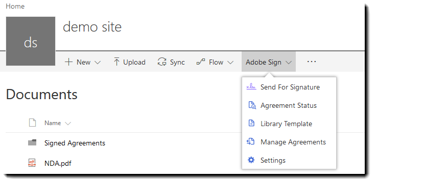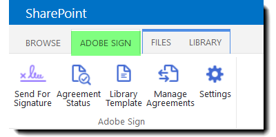 Adobe Sign is an add-in application that is installed by your SharePoint Admin. As a User, you can see the Adobe Sign tab at the top of your SharePoint site.