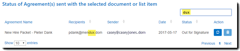 You can easily search for all the Agreements sent using a SharePoint document or list by: