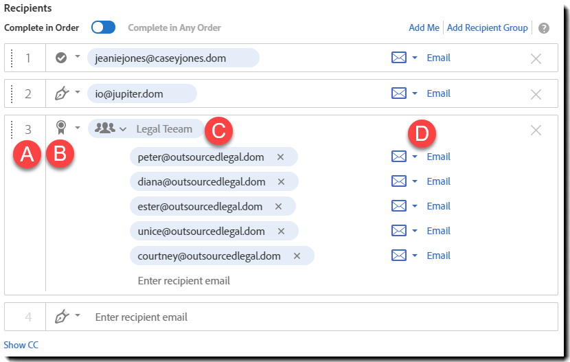 ○ Add Recipient Group – Sometimes, a recipient in the signature cycle can be one of several people. For example, if you need someone from the legal team to sign off, but it can be any one of five individuals. Recipient groups allow the Sender to list all five possible signers, but only require one of the five to apply a signature. (See recipient 3 in the image above)