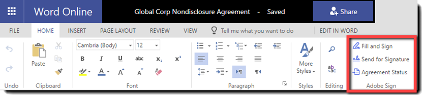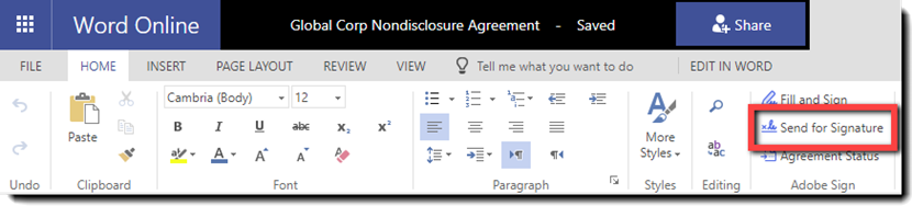2. Find the Adobe Acrobat Sign icons in the ribbon, and click Send for Signature.