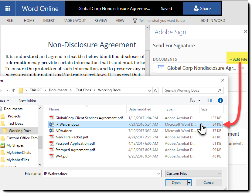 Just to the right of the Document heading is the + Add Files link that allows you to add more files to the agreement. Adding agreements works just like the web application. The documents are presented to the recipients in the order they are listed in the add-in panel