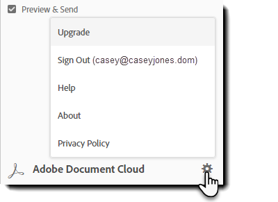 At the very bottom of the add-in panel, to the right of Adobe Document Cloud, is a gear icon that opens the add-in settings: