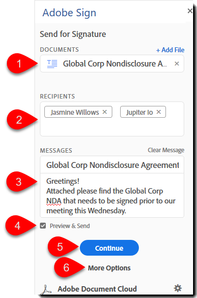 Note: If you are accustomed to setting recipient roles, be aware that all recipients are considered Signers when configured in the add-in. If other roles are required, click the More Options link under the Send / Continue button.