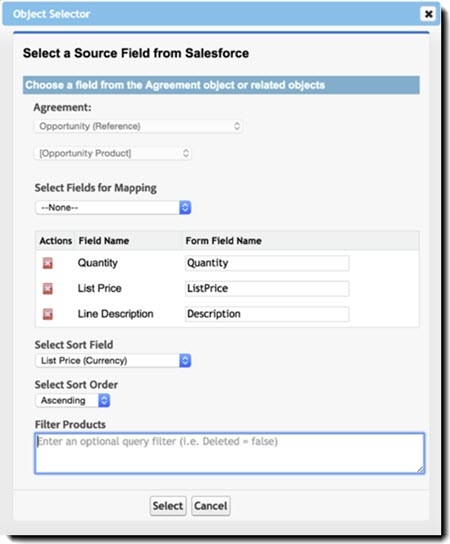 You can now automatically add your product lists to an agreement for signature. The merge mappings have been expanded to include all products tied to an opportunity. You can set which product attributes (like quantity and price) are included in your agreements as well as sort and filter the associated products.