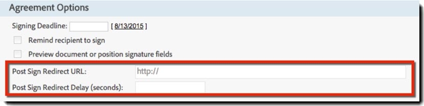 You can now auto-redirect the signers of an agreement to a specified URL after they sign. For example, you can redirect signers to your company website or a survey page. Also specify how many seconds elapse before executing the redirect. The option to enter a redirect URL and specify the number of seconds is available on the Send Agreement page when the Enable Post Sign Options setting is enabled, and it can be set to read-only using the Read Only Post Sign Options setting.
