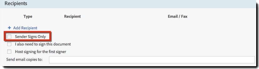 Your team can now sign any given document with "Only I Sign.” To do so, the sender can select the Sender Signs Only option on the Send Agreement page. The sender can then upload the document, drag and drop any required form fields onto it, and sign it. The document can be sent to the sender and any additional recipients specified. A record of this process is automatically generated in Salesforce, and a copy of the document is stored there as well. The Sender Signs Only option appears if the Enable Sender Signs Only setting is enabled, and it can be set to read-only using the Read Only Sender Signs Only setting.
