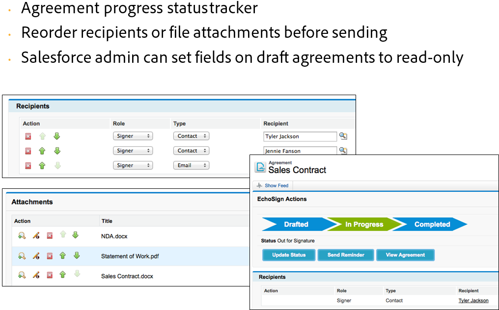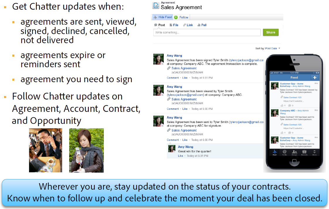 Your team members can now be alerted from within Salesforce when an agreement they’ve sent is about to expire. This option is controlled using the Create Sign Deadline Reminder Event and the Days Sign Deadline Reminder Event. The sender sees a pop- up alert in Salesforce and can then take action by contacting the signer and possibly extending the deadline.